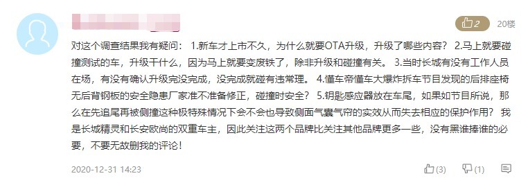此后还有长城精灵和长安欧尚双重车主的网友,对测试废车升级、升级多重确认、座椅无后背钢板的安全隐患等问题发表了意见,可见对于本次事件最终给出的答案还有一些疑虑。不过,从介入调查到结果公布,长城汽车对产品和消费者负责的态度还是值得肯定的。