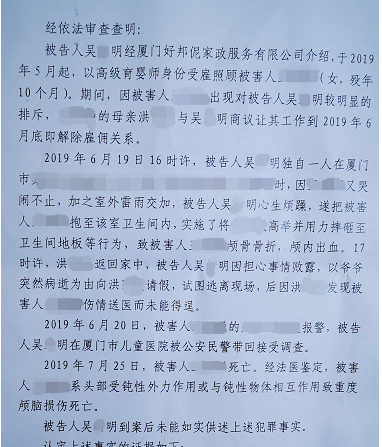 厦门市人民检察院的起诉书显示,2019年6月19日16时许,被告人吴某在照顾被害人时,