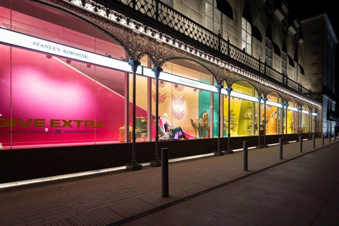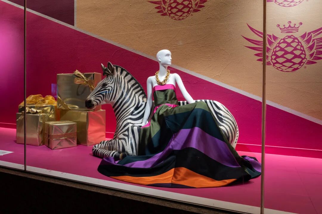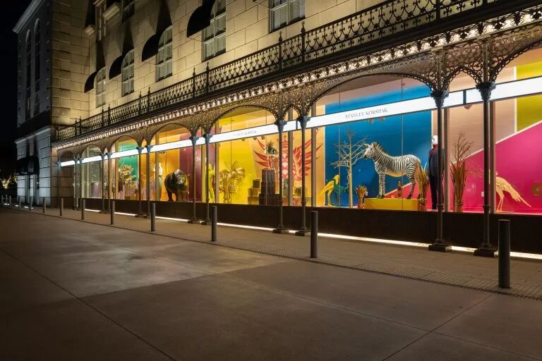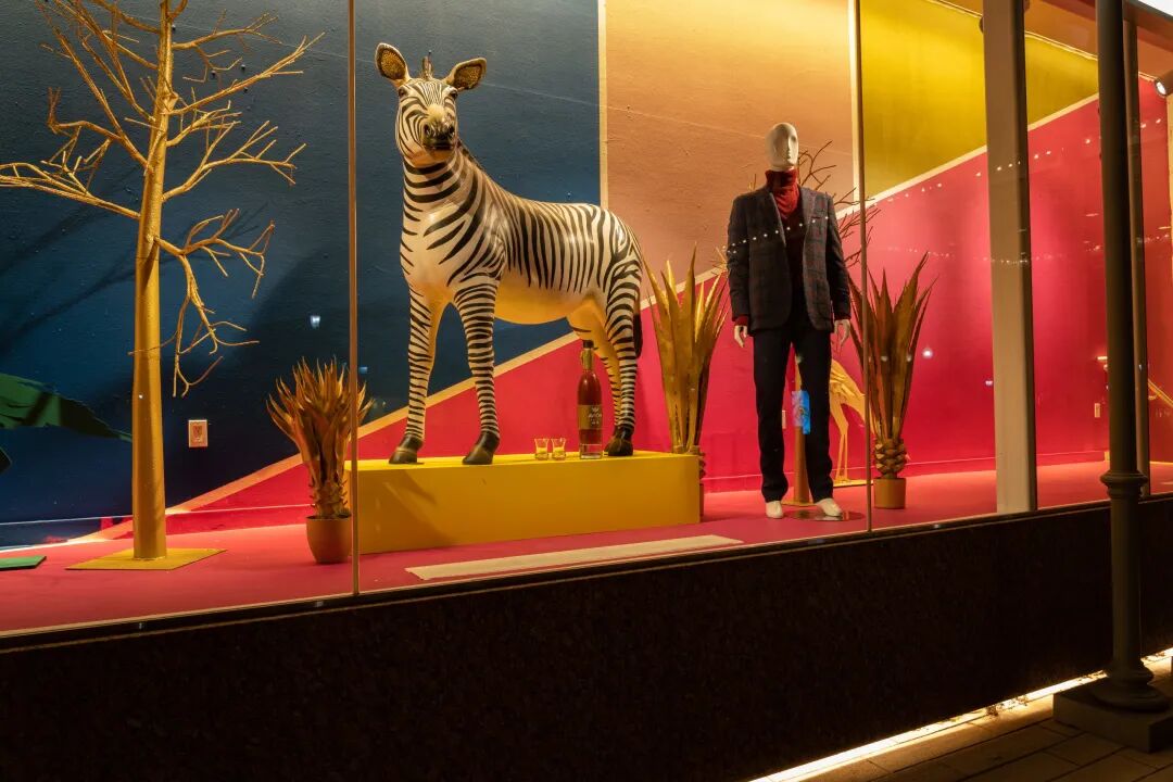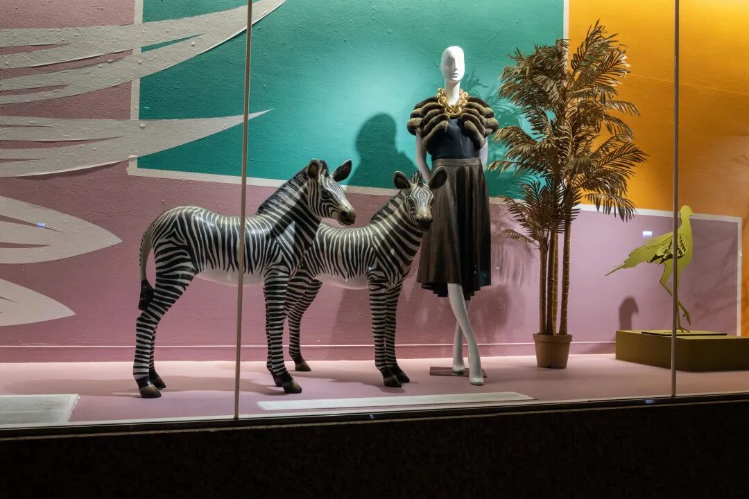 44标志,这个概念延伸了近1000英尺长,从2020年11月开始展示了近三个月。此次展览以真人大小的动物为特色,搭配大胆的色块和材料,由这家专业服装零售商的创意总监布莱特·麦金尼(Bret