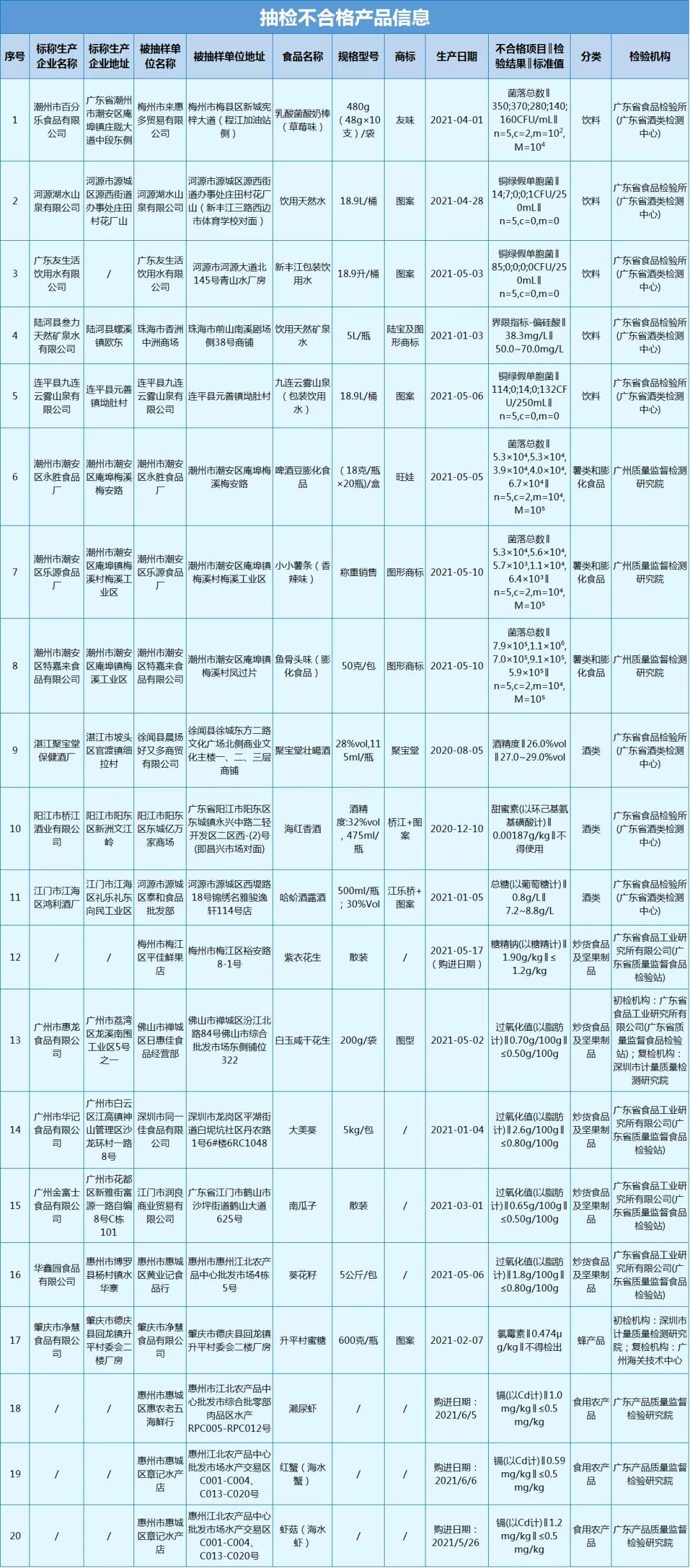 对吃货而言 零食肯定是不能少的 毕竟不能让嘴巴寂寞不是 特别是 酸奶棒、花生、瓜子、薯条等零食 绝对是打发时间的好东西 不过最近 广东省市场监督管理局组织抽检 发现不合格样品20批次 涉及多款零食 根据2021年国家和广东省食品安全监督抽检计划,广东省市场监督管理局组织抽检饮料、薯类和膨化食品、糖果制品、酒类、炒货食品及坚果制品、蜂产品和食用农产品等7类食品1128批次样品。 根据食品安全国家标准检验和判定,其中抽检项目合格样品1108批次、不合格样品20批次,检出微生物污染、兽药残留、重金属污染、食品添加剂超限量超范围使用及其他指标问题。 但是看到这些问题食品 千万不要买 <点击图片可放大> 不合格的20批次食品 分别涉及以下问题 ▼ 01 微生物污染问题 (一)梅州市来惠多贸易有限公司销售的标称潮州市百分乐食品有限公司生产的乳酸菌酸奶棒(草莓味),菌落总数不符合食品安全国家标准规定。 (二)标称河源湖水山泉有限公司生产的饮用天然水,铜绿假单胞菌不符合食品安全国家标准规定。 (三)标称广东友生活饮用水有限公司生产的新丰江包装饮用水,铜绿假单胞菌不符合食品安全国家标准规定。 (四)标称连平县九连云雾山泉有限公司生产的九连云雾山泉(包装饮用水),铜绿假单胞菌不符合食品安全国家标准规定。 图源:IC photo(图文无关) (五)标称潮州市潮安区永胜食品厂生产的啤酒豆膨化食品,菌落总数不符合食品安全国家标准规定。 (六)标称潮州市潮安区乐源食品厂生产的小小薯条(香辣味),菌落总数不符合食品安全国家标准规定。 (七)标称潮州市潮安区特嘉来食品有限公司生产的鱼骨头味(膨化食品),菌落总数不符合食品安全国家标准规定。 图源:IC photo(图文无关) 02 兽药残留问题 标称肇庆市净慧食品有限公司生产的升平村蜜糖,氯霉素不符合食品安全国家标准规定。 03 重金属污染问题 (一)惠州市惠城区惠农老五海鲜行销售的濑尿虾,镉(以Cd计)不符合食品安全国家标准规定。 (二)惠州市惠城区章记水产店销售的红蟹(海水蟹)和虾菇(海水虾),镉(以Cd计)不符合食品安全国家标准规定。 04 食品添加剂超限量 超范围使用问题 (一)阳江市阳东区东城亿万家商场销售的标称阳江市桥江酒业有限公司生产的海红香酒,甜蜜素(以环己基氨基磺酸计)不符合食品安全国家标准规定。 (二)梅州市梅江区平佳鲜果店销售的紫衣花生,糖精钠(以糖精计)不符合食品安全国家标准规定。 05 其他指标问题 (一)珠海市香洲中洲商场销售的标称陆河县叁力天然矿泉水有限公司生产的饮用天然矿泉水,偏硅酸不符合产品标签标示要求。 (二)徐闻县晨扬好又多商贸有限公司销售的标称湛江聚宝堂保健酒厂生产的聚宝堂壮暘酒,酒精度不符合产品标签标示要求。 (三)河源市源城区泰和食品批发部销售的标称江门市江海区鸿利酒厂生产的哈蚧酒露酒,总糖(以葡萄糖计)不符合产品明示标准和质量要求。 (四)佛山市禅城区日惠佳食品经营部销售的标称广州市惠龙食品有限公司生产的白玉咸干花生,过氧化值(以脂肪计)不符合食品安全国家标准规定。 (五)深圳市同一佳食品有限公司销售的标称广州市华记食品有限公司生产的大美葵,过氧化值(以脂肪计)不符合食品安全国家标准规定。 (六)江门市润良商业贸易有限公司销售的标称广州金富士食品有限公司生产的南瓜子,过氧化值(以脂肪计)不符合食品安全国家标准规定。 (七)惠州市惠城区黄业记食品行销售的标称华鑫园食品有限公司生产的葵花籽,过氧化值(以脂肪计)不符合食品安全国家标准规定。 这些不合格产品 目前都怎么处理呢? ▼ 广东省市场监督管理局已要求辖区市场监管部门及时对不合格食品及其生产经营者进行调查处理,责令企业查清产品流向,采取下架、召回不合格产品等措施控制风险,并分析原因进行整改。同时要求辖区市场监管部门将相关情况记入生产经营者食品安全信用档案,并按规定在监管部门网站上公开相关信息。 图源:IC photo(图文无关) 最后,小编提醒大家—— 应当在正规可靠渠道购买所需食品并保存相应购物凭证,要看清外包装上的相关标识,如生产日期、保质期、生产者名称和地址、成分或配料表、食品生产许可证编号等标识是否齐全并符合法律法规的规定。 不要购买 无厂名、厂址、生产日期和保质期的产品 不要购买超过保质期的产品 不要购买公布的不合格产品 欢迎广大消费者 积极参与食品安全监督 关注食品安全抽检信息公布 如您在市场上发现 本次公布信息中所涉的不合格食品 请及时拨打 当地投诉举报电话12345或12315 来源:广东省市场监督管理局、深圳大件事,如有侵权请联系删除。本文仅代表作者观点,不代表大湾网的观点立场 |