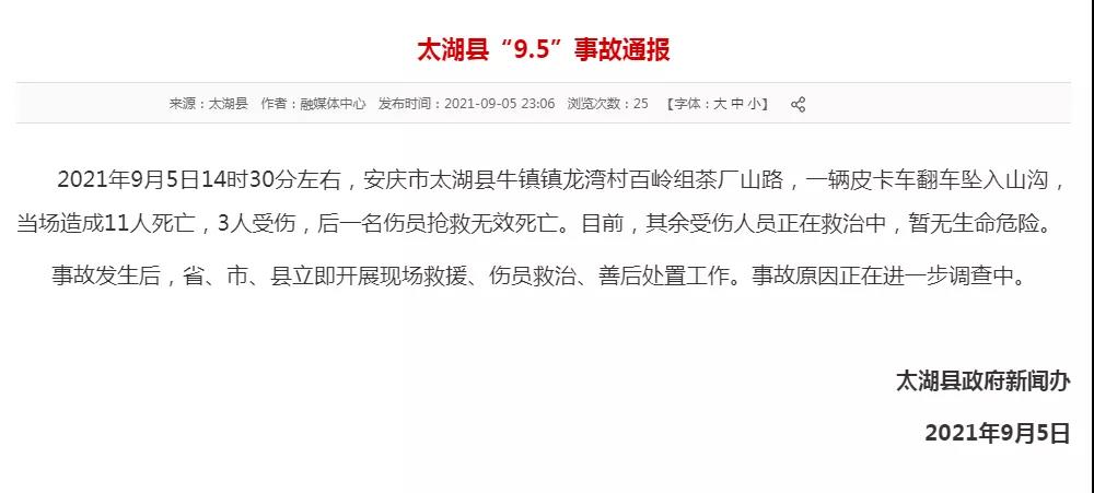 2021年9月5日14时30分左右,安徽安庆市太湖县牛镇镇龙湾村百岭组茶厂山路,一辆皮卡车翻车坠入山沟,当场造成11人死亡,3人受伤,后一名伤员抢救无效死亡。目前,其余受伤人员正在救治中,暂无生命危险。