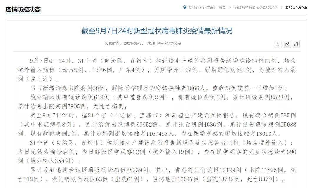 9月7日0—24时,31个省(自治区、直辖市)和新疆生产建设兵团报告新增确诊病例19例,均为境外输入病例(云南9例,上海6例,广东4例);无新增死亡病例。新增疑似病例1例,为境外输入病例(在上海)。 当日新增治愈出院病例50例,解除医学观察的密切接触者1666人,重症病例较前一日增加1例。 境外输入现有确诊病例618例(其中重症病例8例),现有疑似病例1例。累计确诊病例8523例,累计治愈出院病例7905例,无死亡病例。 截至9月7日24时,据31个省(自治区、直辖市)和新疆生产建设兵团报告,现有确诊病例795例(其中重症病例8例),累计治愈出院病例89652例,累计死亡病例4636例,累计报告确诊病例95083例,现有疑似病例1例。累计追踪到密切接触者1167468人,尚在医学观察的密切接触者13013人。 31个省(自治区、直辖市)和新疆生产建设兵团报告新增无症状感染者11例(均为境外输入);当日无转为确诊病例;当日解除医学观察22例(境外输入19例);尚在医学观察的无症状感染者390例(境外输入358例)。 累计收到港澳台地区通报确诊病例28239例。其中,香港特别行政区12129例(出院11825例,死亡212例),澳门特别行政区63例(出院61例),台湾地区16047例(出院13742例,死亡837例)。 最新通报!排除新冠病毒感染 秋冬季是呼吸道传染病的高发季节,要更加重视个人防护,防范新冠肺炎疫情反弹。 勤洗手,使用肥皂或洗手液流水洗手,没有流水时可用含酒精免洗消毒剂;洗手时机要把握,外出回家、饭前便后、触摸口鼻眼部位之前、接触生猛海鲜之后、接触公共物品之后、摘除口罩后都要洗手。 公共场所尽可能与他人之间保持1米以上距离,避免与有发热或呼吸道症状等身体不适者接触,聚餐使用公勺公筷。 不随地吐痰,咳嗽打喷嚏用纸巾遮挡,紧急时可用衣袖或手肘遮挡,避免使用双手捂嘴鼻,万一使用双手应及时清洗。 商场超市、农贸市场、影院展馆多数人流量大,通风不佳;冰鲜食品,禽畜海鲜均存在被新冠病毒污染的风险,进入这些场所或者接触高危物品应严格佩戴口罩,遮住口鼻,罩住健康。 做好自我健康监测,发现不适及时向正规医疗机构咨询和就医;保持居家环境清洁,勤通风、勤晒衣被;合理膳食、加强营养、适度运动,保持健康体魄; 诺如病毒是全球急性胃肠炎的散发病例和暴发疫情的主要致病原。流行高峰大约为当年的10月份左右到次年的四月份左右,常被称为“冬季呕吐病”。 聚集性和暴发疫情主要发生在学校、托幼机构等人群聚集场所。 防治要点: 1、要保持良好的个人卫生习惯,不吃生冷变质的食物,彻底清洗生食的水果和蔬菜,海鲜类食品一定要彻底地煮熟煮透后再食用。平时注意饮用水卫生。 2、勤洗手用肥皂和流水至少冲洗20秒,防止病毒经手进入消化道。需要注意的是,消毒纸巾和免冲洗的手消毒液不能代替标准洗手程序。 3、流行季节,少去人多的公共场所,减少感染机会。 4、平时要注意锻炼身体,增强体质;当出现腹泻和呕吐症状时应及时就医,并和家人相对隔离,呕吐和腹泻后应清洗和消毒被污染的环境表面和衣物等。厨工应该保持良好的手部卫生,避免裸手直接接触即食食品。 5、集体单位在发现疫情苗头时应及时和辖区疾控中心联系,共同核实和尽快处置疫情。 2021年7月以来,国内多地都报告过人感染禽流感病例,并且禽类感染的报道也时有发生,提示禽流感病毒在环境中依然存在,且感染人的风险没有降低。 人感染禽流感的主要感染来源是接触染毒的活禽或去过受污染的活禽市场。患者初期一般表现为流感样症状,如发热、咳嗽、气短,可伴有头痛、肌肉酸痛、腹泻等全身症状。 重症患者病情发展迅速,多在发病3~7天出现重症肺炎,体温大多持续在39℃以上,呈重症肺炎等表现。 防病措施: 1、尽量避免接触活禽或去往有活禽的场所,如必须接触,应做好个人防护,如佩戴口罩和手套。接触之后需要彻底清洁双手; 2、在正规市场采购经检疫合格的冷鲜禽,避免采购活禽; 3、处理禽类时注意个人防护,佩戴口罩、手套,并尽快清洗双手; 4、注意生熟分开,禽类要彻底煮熟后食用,不采购、烹饪、食用来源不明的禽类或病死禽; 5、去往野生禽类较多的公园、活禽散养较多的地区、有活禽售卖的市场时应当注意个人防护并减少接触。 肺结核是由结核分枝杆菌引起的一种慢性呼吸道传染病,病原学阳性的肺结核患者为其重要的传染源。本病主要通过呼吸道飞沫传播,随着开学季到来,要警惕学校聚集性疫情的发生。 预防措施: 1、把好新生入学体检关,将结核病检查项目作为新生入学体检和教职员工常规体检的必查项目; 2、充分利用学生晨检、因病缺勤和病因追踪等工作,加强学校结核病主动监测,及时发现病例,防止蔓延扩散;认真做好密切接触者的筛查、医学观察和随访工作; 3、居室内经常开窗通风,不随地吐痰,咳嗽、打喷嚏时遮掩口鼻; 4、咳嗽、咳痰2周以上,或痰中带血,应怀疑是否得了肺结核,要及时接受检查;如出现肺结核可疑症状或被诊断为肺结核后,要主动向学校报告,不隐瞒病情、不带病上课;一旦诊断为肺结核,应立即在结核病定点医疗机构接受规范治疗。学生肺结核患者应按《中国学校结核病防控指南》相关要求接受休复学管理。 除了做好以上防病措施 秋季出门遛娃放风 也要谨防蜱虫等 来源:科普中国微信公众平台,如有侵权请联系删除。本文仅代表作者观点,不代表大湾网的