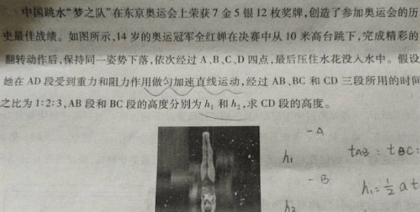 东京奥运会上夺金并打破世界纪录,全运会上再次率队夺金,年仅14岁、接连上演“水花消失术”的全红婵已经成了全民偶像,还成了考点。 据网友贴出的某地一张中学物理试卷上,其中一道题就从中国跳水队和全红婵引出了知识点。 考题写道:中国跳水梦之队在东京奥运会上荣获7金5银12枚奖牌,创造了参加奥运会的历史最佳战绩。 14岁的奥运冠军全红婵在决赛中从10米高台落下,完成精彩翻转动作后,保持同一姿势下落,依次经过ABCD四个点,最后压住水花没入水中。 假设她在AD段收到重力和阻力作用,做匀加速直线运动,经过AB、BC和CD三段所用的时间只比为1:2:3,AB段和BC段的高度分别为h1和h2,求CD段的高度。 这道题目测试的是学生对重力加速度的理解,而众多根本不会解体的网友转移焦点,纷纷做恍然大悟状:原来全红婵做的是匀加速直线运动,“水花消失术”的秘诀终于找到了…… 来源:凤凰网,如有侵权请联系删除。本文仅代表作者观点,不代表大湾网的观点立场 |