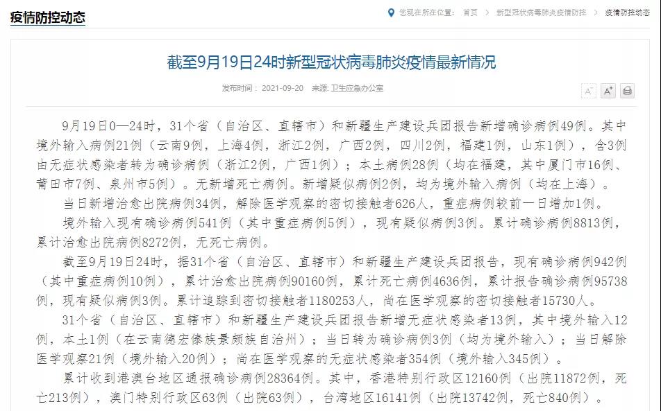 9月19日0—24时,31个省(自治区、直辖市)和新疆生产建设兵团报告新增确诊病例49例。其中境外输入病例21例(云南9例,上海4例,浙江2例,广西2例,四川2例,福建1例,山东1例),含3例由无症状感染者转为确诊病例(浙江2例,广西1例);本土病例28例(均在福建,其中厦门市16例、莆田市7例、泉州市5例)。无新增死亡病例。新增疑似病例2例,均为境外输入病例(均在上海)。