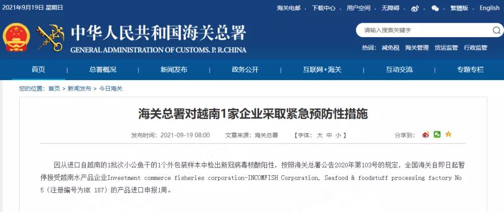 因从进口自越南的1批次小公鱼干的1个外包装样本中检出新冠病毒核酸阳性,按照海关总署公告2020年第103号的规定,全国海关自即日起暂停接受越南水产品企业Investment commerce fisheries corporation-INCOMFISH Corporation, Seafood & foodstuff processing factory No 5(注册编号为HK 187)的产品进口申报1周。