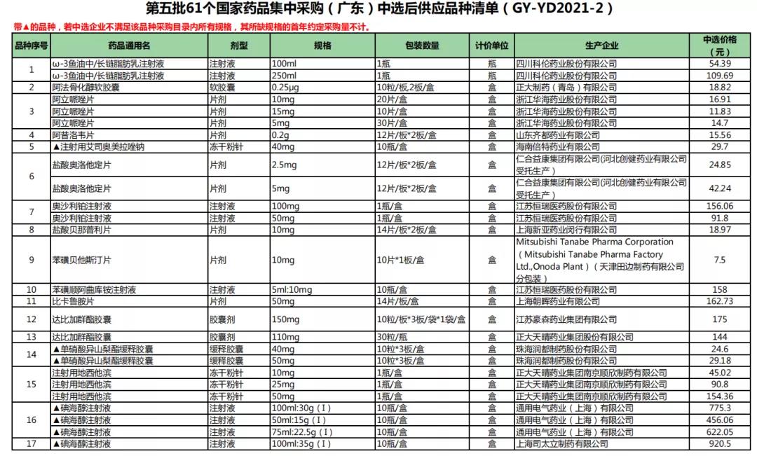 据广东省医保局官网消息, 广东省决定首年采购周期 从2021年10月9日零时起 执行第五批集中采购中选结果及配套政策。 9月22日,《广东省医疗保障局 广东省卫生健康委员会 广东省药品监督管理局关于做好第五批国家组织药品集中采购和使用工作的通知》(以下简称《通知》)发布。 《通知》称,结合广东省实际,为做好第五批国家组织药品集中采购和使用落地实施工作,广东省决定首年采购周期从2021年10月9日零时起执行第五批集中采购中选结果及配套政策。 《通知》要求广东各地要提前及时做好医保基金预付,医保支付系统调整(医保支付标准另行发文),开展经办机构和医疗机构培训,加强中选药品使用情况和合同履约情况的监测,保证使用、确保质量、保障供应、保证回款,确保第五批集中采购政策落实。 第五批国家组织药品集中带量采购6月28日在上海揭晓结果。 第五批国家药品集采拟中选产品251个,药品品种达到61种,为历次国家药品集采品种数量最多的一次,拟中选药品平均降价56%。 此次集采品种覆盖高血压、冠心病、糖尿病、抗过敏、抗感染、消化道疾病等常见病、慢性病用药。 《通知》附上了第五批61个国家药品集中采购(广东)中选结果表、中选后供应品种清单、首年约定采购量。 ↓↓ 点击图片放大查看 ↓↓ 来源:广州日报综合广东省医保局官网、新华社 广州日报·新花城编辑 林传凌 |