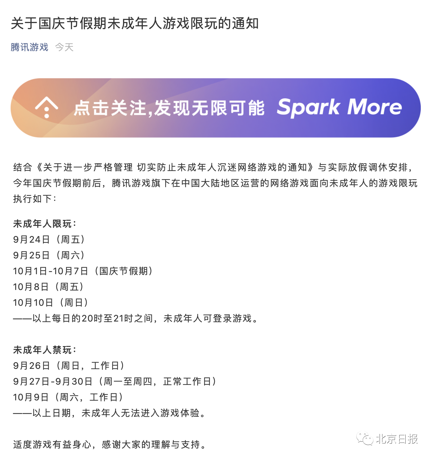 9月24日晚,腾讯游戏、网易游戏发布了关于国庆节假期未成年人限玩的通知,并提醒玩家合理安排游戏时间、适度游戏。 近日,国家新闻出版署下发《关于进一步严格管理 切实防止未成年人沉迷网络游戏的通知》。通知要求: 所有网络游戏企业仅可在周五、周六、周日和法定节假日每日20时至21时向未成年人提供1小时服务,其他时间均不得以任何形式向未成年人提供网络游戏服务; 不得以任何形式向未实名注册和登录的用户提供游戏服务; 各级出版管理部门要加强对防止未成年人沉迷网络游戏有关措施落实情况的监督检查,对未严格落实的网络游戏企业,依法依规严肃处理; 积极引导家庭、学校等社会各方面共管共治,依法履行未成年人监护责任,为未成年人健康成长营造良好环境。 |