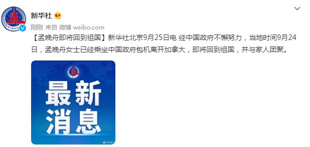 : 【孟晚舟即将回到祖国】新华社北京9月25日电 经中国政府不懈努力,当地时间9月24日,孟晚舟女士已经乘坐中国政府包机离开加拿大,即将回到祖国,并与家人团聚。 ...
