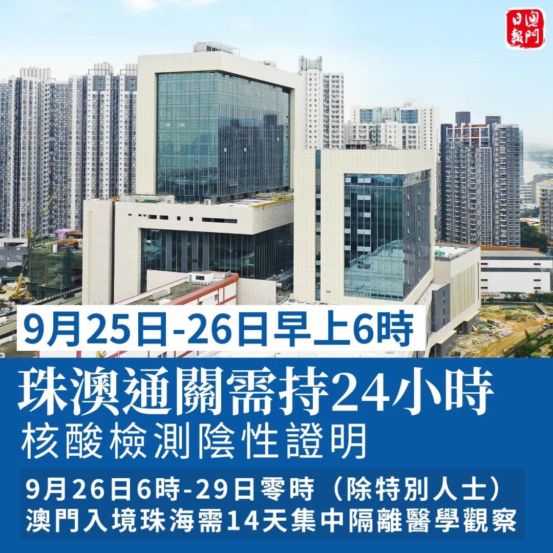 珠海市新型冠状病毒肺炎疫情防控指挥部办公室今晨发出消息,自2021年9月25日早上6时至2021年9月26日早上6时,经珠澳口岸入境人员需持24小时内核酸检测阴性结果证明。