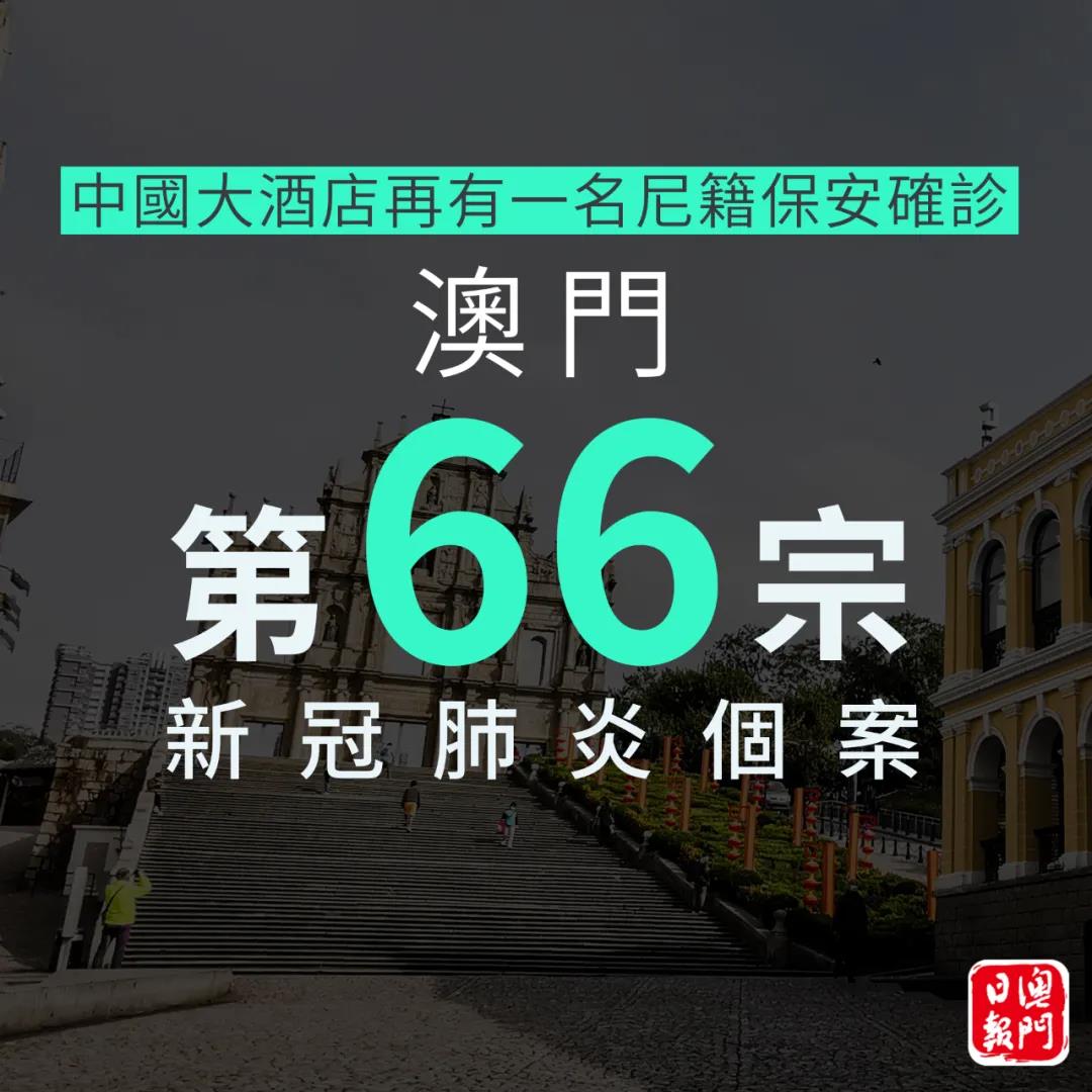 本澳今日确诊1名输入关联病例,为本澳第66例新冠病毒肺炎确诊病例。患者为32岁男性,尼泊尔籍,于金皇冠中国大酒店任职保安,因该酒店隔离医学观察中发现1名输入性病例而被要求接受核酸检测,今日证实阳性,该患者已安排到公共卫生临床中心接受医学观察,并接受流行病学调查,详细情况稍后公布。该名保安平日的工作职责为测量体温。