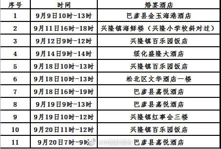 9月21日,哈尔滨市巴彦县发生本土疫情,目前,已确诊病例轨迹涉及多场婚宴。请参加以下婚宴的人,第一时间向所在社区(村)或工作单位报备,开展落实各项防控措施。