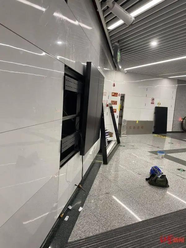 成都地铁告诉记者,由于本次维修作业,需要在安装时拆除该损坏瓷砖上方的干挂瓷砖后才可安装,而在拆除过程中,有三块干挂瓷砖被LED电子屏遮挡,还需拆除电子屏幕。