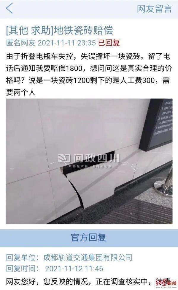 撞坏地铁站内一块瓷砖赔了1800元?成都地铁回应