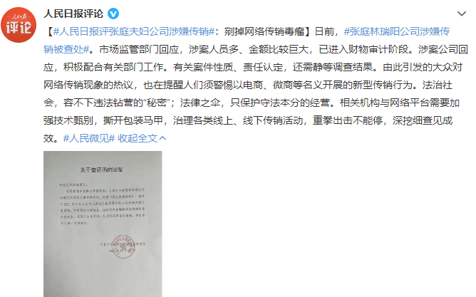 对此,人民日报发文评论称,日前,张庭林瑞阳公司涉嫌传销被查处。市场监管部门回应,涉案人员多、金额比较巨大,已进入财物审计阶段。涉案公司回应,积极配合有关部门工作。有关案件性质、责任认定,还需静等调查结果。由此引发的大众对网络传销现象的热议,也在提醒人们须警惕以电商、微商等名义开展的新型传销行为。法治社会,容不下违法钻营的“秘密”;法律之伞,只保护守法本分的经营。相关机构与网络平台需要加强技术甄别,撕开包装马甲,治理各类线上、线下传销活动,重拳出击不能停,深挖细查见成效。