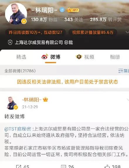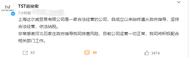 据中国网去年12月28日报道,石家庄市裕华区市场监督管理局以《查证函回复》的形式,公开披露了知名日化品牌“TST庭秘密”运营主体达尔威公司涉嫌利用网络从事传销活动被查处的进展。该局早在今年6月5日就已对上海市达尔威贸易有限公司涉嫌传销进行立案调查,“因其利用金融机构转移或隐匿涉传销资金,该局已依法申请人民法院采取保全措施,目前案件在进一步调查中”。12月29日凌晨,@TST庭秘密 微博发布声明称,上海达尔威贸易有限公司是一家合法经营的公司,自成立以来始终遵从政府指导,坚持合法经营,依法纳税。“非常感谢河北石家庄政府指导我司排查风险,目前公司运营一切正常,我司将积极配合相关部门工作。” 随后,演员张庭也通过其个人微博转发了上述声明。