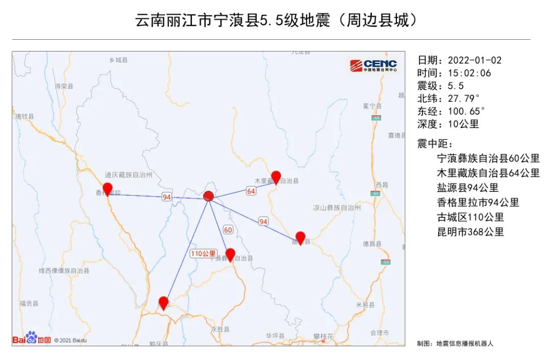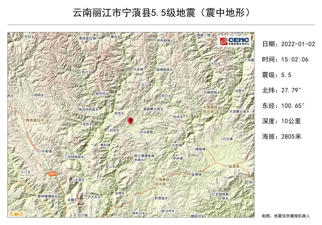 今天(1月2日)15时02分,在云南丽江市宁蒗县(北纬27.79度,东经100.65度)发生5.5级地震,震源深度10千米