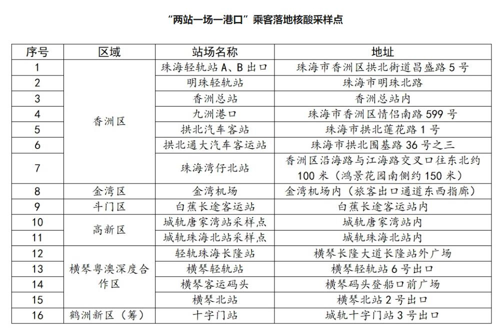 珠海市卫健局表示,为进一步巩固疫情防控成果,珠海市将继续加强来(返)珠人员核酸检测排查措施,2021年12月25日凌晨0时至2022年3月15日晚上12时期间,珠海市将实施“两站一场一港口”落地核酸检测措施。