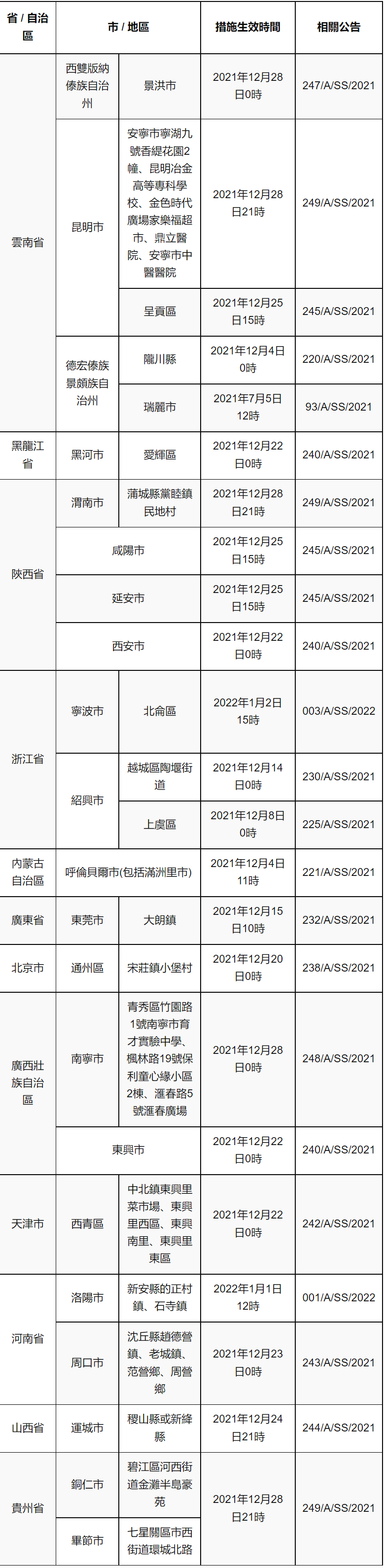 新型冠状病毒感染应变协调中心宣布,因应浙江省的疫情变化,自2022年1月2日下午3时起,所有曾经到过浙江省宁波市北仑区的入境人士,须按照卫生当局的要求在指定地点接受医学观察至离开当地后14天但最短不少于7天。 而所有曾经到过上述地方的已入境人士,其健康码将变为黄码及须接受自我健康管理至离开当地14天为止,期间须在开始措施的第1、2、4、7、12天接受最多5次的新冠病毒核酸检测。免费核酸检测预约链接为https://app.ssm.gov.mo/mandatoryrnatestbook。核酸检测结果不会上载至澳门健康码亦不可作为出入境用途。如需将核酸检测结果在澳门健康码显示,则须自费检测。 应变协调中心提醒,14天内曾到过以下地区的人士,须在入境时或其他须出示时在澳门健康码上如实作出相应申报及接受相应的防疫措施,离开当地21天内出现任何疑似新冠病毒感染疑似症状人士须立即就医及接受核酸检测: