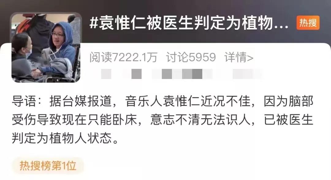近日,据台媒报道 著名音乐人袁惟仁 因身体状况不佳 被医生判定为无意识状态 (即植物人) 一让人揪心的消息 昨天登上了微博热搜第一 #袁惟仁被医生判定为植物人# 2018年10月17日,袁惟仁在上海参加活动时,突发脑溢血昏迷不醒。在上海瑞金医院治疗62天,同时还被查出脑部有肿瘤。随后,他被送回台北荣总加护病房治疗,并切除脑瘤,之后则返回台东老家疗养。 2019年,有媒体在医院直击消瘦的袁惟仁瘫坐在轮椅上,鼻子上装鼻胃管,身上盖大毛巾御寒,由亲友推到户外湖边晒太阳。 当时是他脑溢血手术后的首度曝光,气色有所好转,还可以与人互动,歌手张宇夫妇也前来探望。 面对后续庞大的疗养、复健及相关看护费用,其好友歌手张宇邀集了至少12位袁惟仁的友人,以每个人1年捐助2万元的方式,把钱交给袁惟仁的母亲全权处置,作为照护他的基金。 经过两年的治疗 袁惟仁情况稳定下来, 不料却在2020年10月 再度住进加护病房。 据报道,当时袁惟仁在家中因为没力气站稳,摔倒撞到头导致昏迷。经过长时间的抢救,袁惟仁的情况平稳下来,但医生表示不能说完全度过危险期,仍需要接受观察。 直到最新的消息—— 袁惟仁目前在家养病 在家人的照料下 原本瘦弱的身体逐渐恢复 但是因头部受伤只能卧床 眼睛可以睁开却无法认人 说到袁惟仁, 他创作的歌曲可谓家喻户晓 袁惟仁1968年6月24日生于中国台湾,1986年,和莫凡成立组合凡人二重唱。1998年,为那英写下《征服》《梦醒了》《梦一场》等歌曲。《征服》入围金曲奖最佳作词最佳作曲。此后更为天后王菲《旋木》作曲,音乐才华备受肯定。 996年——2004年期间,袁惟仁为S.H.E、动力火车、齐秦、迪克牛仔、熊天平、许美静、许茹芸、郑秀文、陶晶莹、张美琦、刘若英、张智成等歌手担任专辑制作人。2007年起,多次担任歌唱比赛的评委。 袁惟仁的微博这三年来没有更新过,从2019年到2021年,每年的6月24日他生日这天系统自动发布生日动态,邀请好友祝他生日快乐。不少网友都在动态下发表评论,表示不见袁惟仁更新微博,也一直没有他的消息 来源:广州日报,如有侵权请联系删除,本文仅代表作者观点,不代表广谈大湾网的观点立场。 |