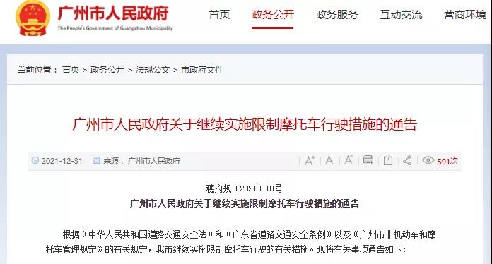 近日,广州市人民政府官网发布了关于继续实施限制摩托车行驶措施的通告。 \