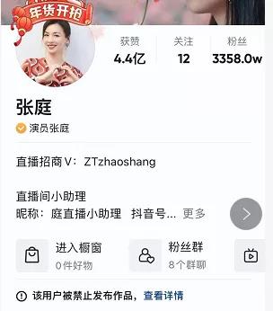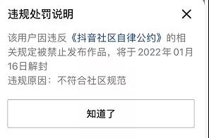 另外,在抖音平台,张庭拥有3358万粉丝的账号已被禁止发布作品。违规处罚说明显示,原因为“不符合社区规范”,将于2022年1月16日解封。