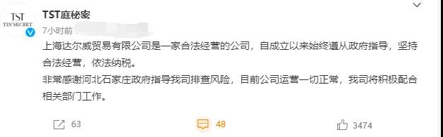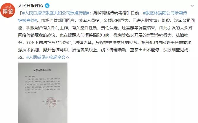 12月29日凌晨,@TST庭秘密 微博发布声明称,上海达尔威贸易有限公司是一家合法经营的公司,自成立以来始终遵从政府指导,坚持合法经营,依法纳税。“非常感谢河北石家庄政府指导我司排查风险,目前公司运营一切正常,我司将积极配合相关部门工作。” 随后,演员张庭也通过其个人微博转发了上述声明。对此,人民日报发文评论称,日前,张庭林瑞阳公司涉嫌传销被查处。市场监管部门回应,涉案人员多、金额比较巨大,已进入财物审计阶段。涉案公司回应,积极配合有关部门工作。有关案件性质、责任认定,还需静等调查结果。由此引发的大众对网络传销现象的热议,也在提醒人们须警惕以电商、微商等名义开展的新型传销行为。法治社会,容不下违法钻营的“秘密”;法律之伞,只保护守法本分的经营。相关机构与网络平台需要加强技术甄别,撕开包装马甲,治理各类线上、线下传销活动,重拳出击不能停,深挖细查见成效。