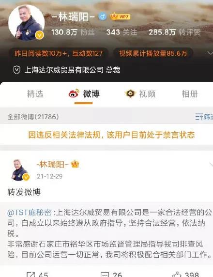 她在抖音上最后一场直播是,2021年12月28日。此前,林瑞阳张庭公司涉嫌传销被查处引发热议。 据中国网去年12月28日报道,石家庄市裕华区市场监督管理局以《查证函回复》的形式,公开披露了知名日化品牌“TST庭秘密”运营主体达尔威公司涉嫌利用网络从事传销活动被查处的进展。该局早在今年6月5日就已对上海市达尔威贸易有限公司涉嫌传销进行立案调查,“因其利用金融机构转移或隐匿涉传销资金,该局已依法申请人民法院采取保全措施,目前案件在进一步调查中”。
