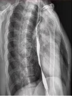 再去医院复诊时,影像结果显示,他的食管中下端居然细成了一根“线”:食管内壁结了厚厚的痂,几乎塞满整个食管,导致食物无法顺利通过,中间最宽的地方只有3毫米左右的空间。