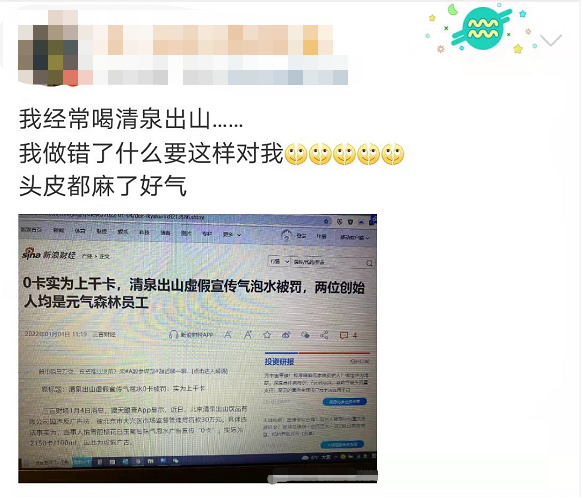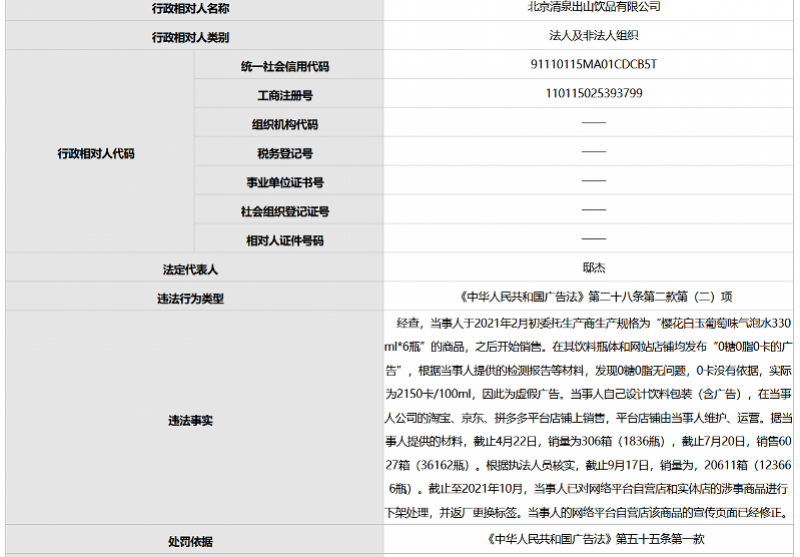 如今的年轻人们 是越来越注重养生了 市场上各类“0糖0卡”的零食饮料 也层出不穷 然而,近日有消息称 一款宣称“0卡”的常见饮料 实际上并非“0卡”? 一起来看看究竟怎么回事 樱花白玉葡萄味气泡水宣称“0卡” 实际为2150卡/100ml 近日,北京清泉出山饮品有限公司因违反广告法,被北京市大兴区市场监督管理局罚款30万元。 北京市市场监管局官网截图 北京市市场监管局官网显示—— 北京清泉出山饮品有限公司于2021年2月初委托生产商生产规格为“樱花白玉葡萄味气泡水330ml*6瓶”的商品,之后开始销售。在其饮料瓶体和网站店铺均发布“0糖0脂0卡的广告”,但根据该公司提供的检测报告等材料,发现0糖0脂无问题,0卡没有依据,实际为2150卡/100ml,因此为虚假广告。 处罚信息还提到,截止至2021年10月,该公司已对网络平台自营店和实体店的涉事商品进行下架处理,并返厂更换标签;该公司的网络平台自营店该商品的宣传页面已经修正。 图源:@清泉出山饮品 针对此事,清泉出山联合创始人孙治强在媒体采访时表示,还在行政复议中。 南都记者查询发现,部分电商平台上涉事产品仍有在售,相关违法表述仍存在。 部分平台相关表述仍存在 清泉出山两位创始人 都曾在元气森林工作过 账号主体为“北京清泉出山饮品有限公司”的微信公众号“清泉出山”中介绍—— 北京清泉出山饮品有限公司成立于2018年,是新一代健康饮品品牌公司,主要产品包括“清汀”气泡水和“困茶”茶饮料。国家企业信用信息公示系统显示,其法定代表人为邸杰。 图源:@清泉出山饮品 公开资料显示,清泉出山的两位创始人都曾在元气森林工作过——