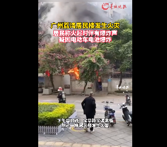 : 羊城晚报视频截图1月5日下午4时许,广州荔湾区宝华路宝源北街附近一栋居民楼发生火警。现场居民介绍,火起时有明火伴随爆炸声,起火原因疑因电动车电池爆炸。下午4时10分,有自称燃气公司工作人员到场紧急处理。下午 ...