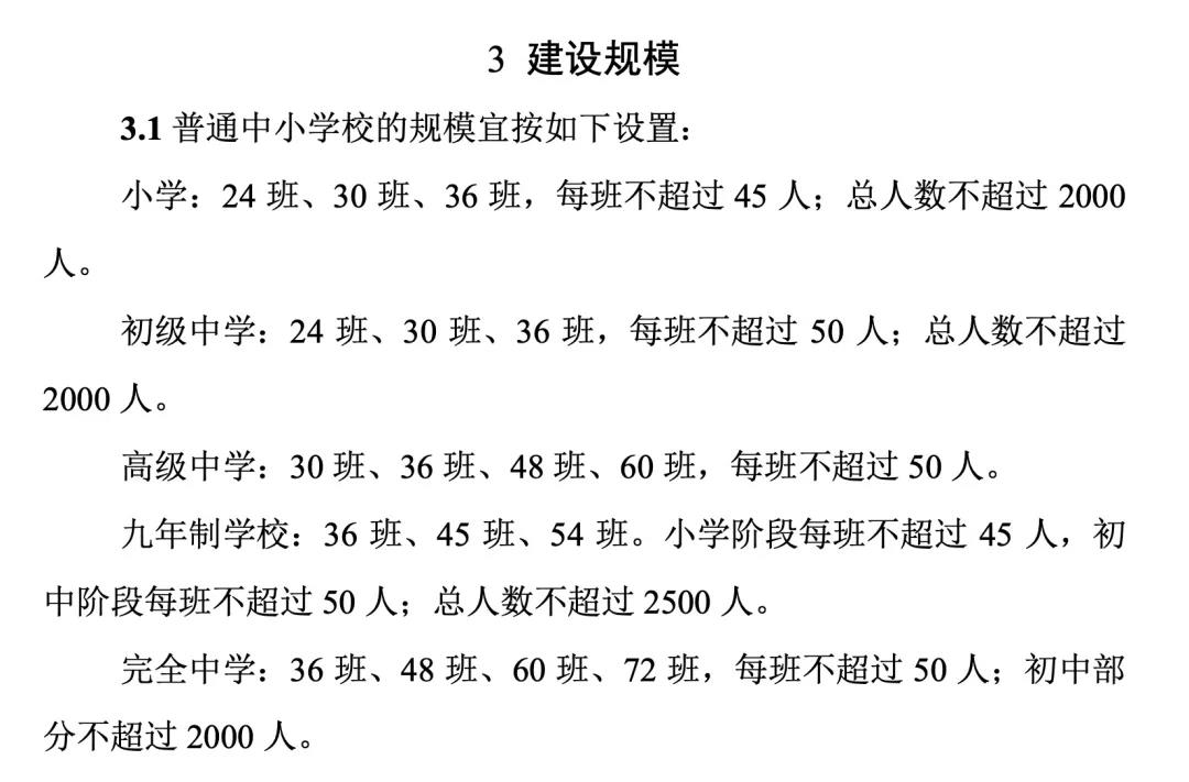 小学校园(资料图)。广州日报·新花城记者 庄小龙 摄 另外,学校建设应远离殡仪馆、医院的太平间、传染病院等,且不与集贸市场、公共娱乐场所、公安看守所、垃圾压缩/转运站、加油加气站、公 交首末站等毗邻,与变电站、易燃易爆场所间的距离应符合《建筑设计防 火规范》等现行有关标准规范的规定。学校应建设在低噪声区域,主要教学用房设置窗户的外墙与铁路路轨的距离不应小于 300 米,与高速路、地上轨道交通线或城市主干道的 距离不应小于 80 米;学校用地尤其是教学区、学生宿舍等不宜设置在城 市轨道交通控制保护区范围内。 当学校选址无法满足上述要求时,应采取相应减震、降噪措施,使教学区、学生宿舍声环境质量符合相关规定。小学:24班、30班、36班,每班不超过45人;总人数不超过2000人。初级中学:24班、30班、36班,每班不超过50人;总人数不超过2000人。高级中学:30班、36班、48班、60班,每班不超过 50人。九年制学校:36班、45班、54班。小学阶段每班不超过45人,初完全中学:36班、48班、60班、72班,每班不超过50人;初中部