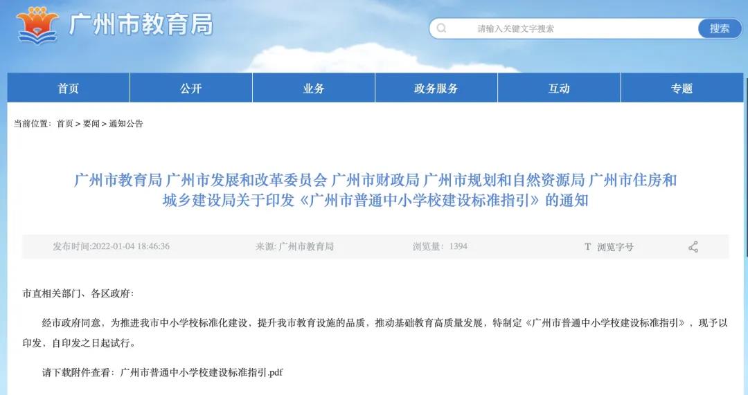 《指引》指出,本指引适用于广州市新建的公办普通中小学校,改、扩建学校及社会力量投资建设的民办普通中小学校参照执行。本指引不作为评价现状中小学校办学条件是否达标的依据。《指引》明确了学校选址布局的基本要求。义务教育阶段学校除满足《中小学校设计规范》的服务半径要求外,还应该充分考虑出行条件,符合广州市15分钟社区生活圈的要求。根据《指引》,居住区规划应合理布局教育设施,原则上小学服务半径宜为500米且步行时间不超过10分钟,初级中学、九年制学校服务半径宜为1000米且步行时间不超过15分钟,方便学生就近入学。结合居住区建设的学校,应保证可独立进出,不受居住区影响。根据《指引》,学校应建设在阳光充足、空气 流动、场地干燥、排水通畅、地势较高、交通便利的宜建地段。