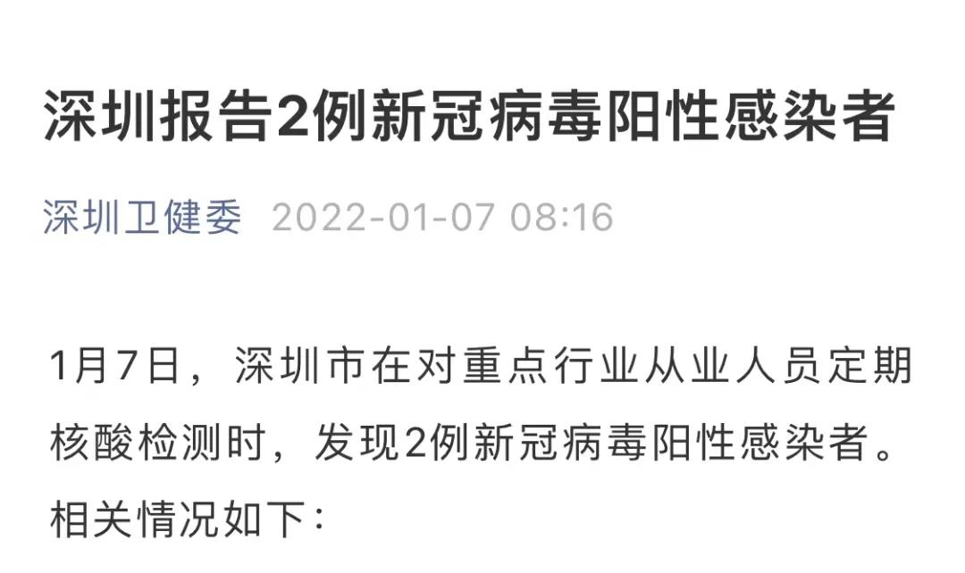 刚刚 据深圳卫健委通报 深圳报告2例新冠病毒阳性感染者具体情况如下 1月7日,深圳市在对重点行业从业人员定期核酸检测时,发现2例新冠病毒阳性感染者。相关情况如下: 2例个案现已转送至市第三人民医院应急院区隔离治疗,相关密接者正在排查中,其居住、工作区域已实施管控,个案活动过的重点场所已进行终末消毒。 在此提醒广大市民进一步做好个人防护,戴口罩、多洗手、勤通风,保持社交距离,配合相关部门做好健康管理。 来源:深圳卫健委、深圳大件事,如有侵权请联系删除,本文仅代表作者观点,不代表广谈大湾网的观点立场。 |