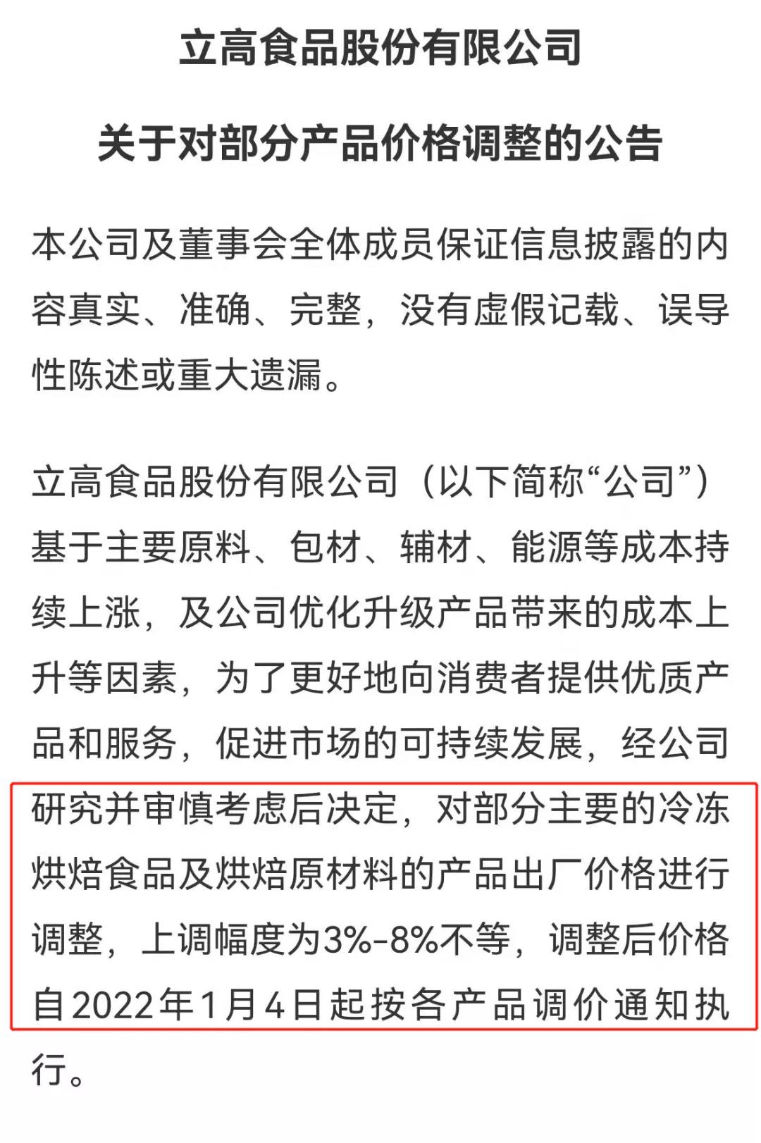 近日,“烘焙食品第一股”立高食品发布公告称,对部分主要的冷冻烘焙食品及烘焙原材料的产品出厂价格进行调整,上调幅度为3%-8%不等,调整后价格自2022年1月4日起按各产品调价通知执行。