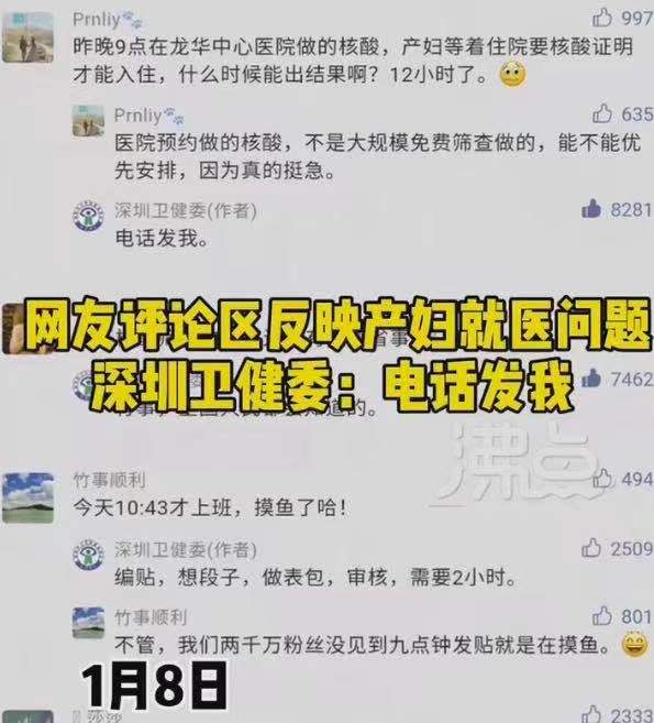 : 【市民反映无核酸#产妇无法住院深圳卫健委回复电话发我#】1月8日,广东深圳,市民在深圳市卫健委公众号文章评论区留言反映,昨晚9点在龙华中心医院做的核酸,产妇等着住院要核酸证明才能入住,什么时候能出结果,12 ...