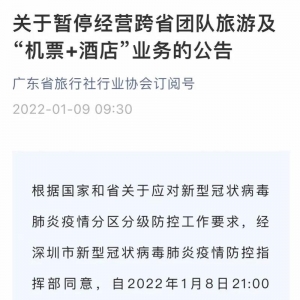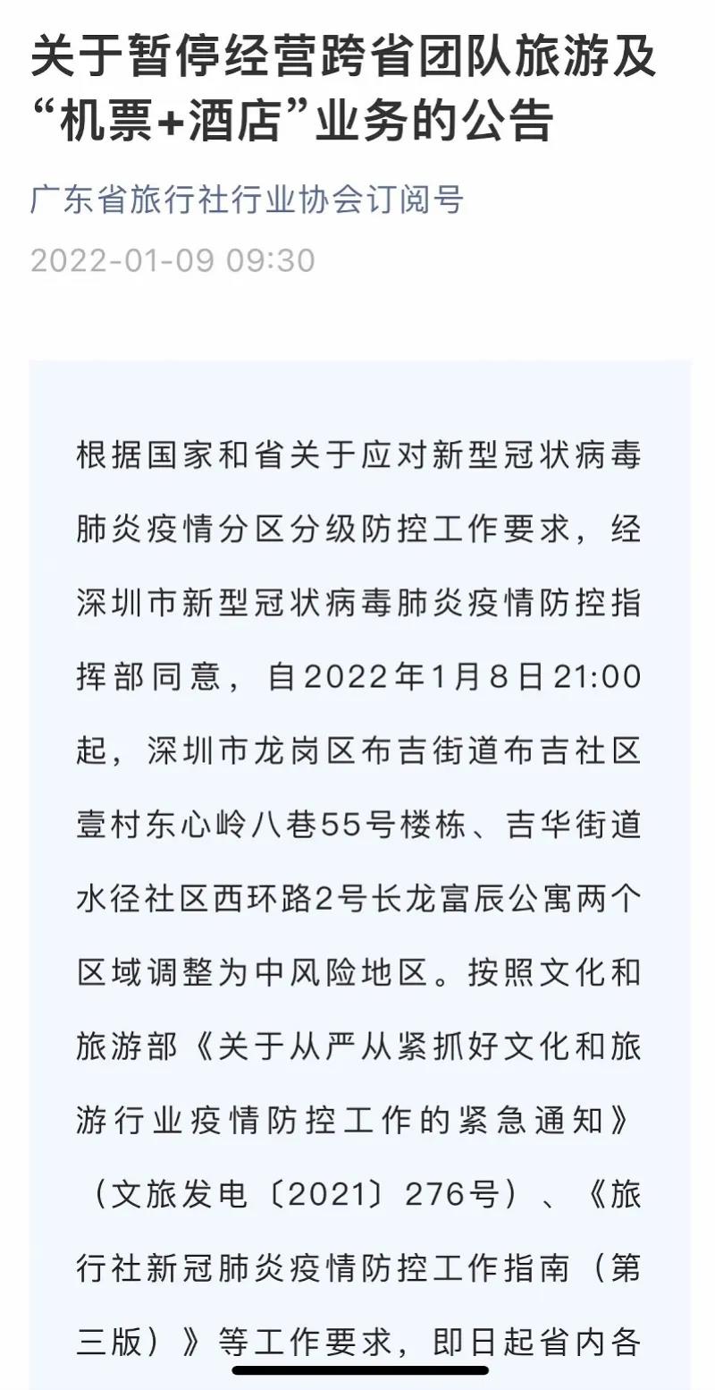 紧急提醒! 深圳最新宣布 深圳市各汽车站暂停营业 1月9日,南都记者从深圳市交通运输局获悉,因深圳龙岗两地升级为中风险地区,省内外部分地市暂停了前往深圳各汽车站的道路客运班线。为确保市民出行安全,深圳市各汽车站暂停营业,复班时间另行通知。 广东暂停跨省团队旅游 及“机票+酒店”业务 1月8日,广东省旅行社行业协会发出《关于暂停经营跨省团队旅游及“机票+酒店”业务的公告》(以下简称《公告》)。 《公告》要求:即日起广东省内各旅行社及在线旅游企业立即暂停经营跨省团队旅游及“机票+酒店”业务,待广东省内全部为低风险地区后,可自行恢复经营跨省团队旅游及“机票+酒店”经营活动。 今日起澳门往返深圳蛇口的 海上客运暂停服务 据“澳门特区发布”今天(1月9日)消息—— 因应新冠疫情的防控工作,澳门(包括外港及氹仔)往返深圳蛇口的海上客运今(9)日起暂停服务,直至另行通知。局方已要求船公司透过多渠道公布相关停运的资讯,包括于网页发布资讯和在码头张贴告示等,并妥善处理已预售船票的退票事宜。 如旅客持有调整未开航的船票,可于调整之日起一个月内,到售票处办理免费改票或全额退票。 中港客运发布公告: 1月9日起部分航班停航 据“中港客运”今天(9日)消息,因疫情防控需要,自2022年1月9日起,蛇口邮轮母港往返中山的航班全线停航;自2022年1月10日起,深圳机场码头往返中山部分航班暂停。复航时间另行通知。 深圳机场码头航线 ▼ 深圳蛇口邮轮母港航线 ▼ 深圳市中医院一门诊临时停诊 今天(1月9日),深圳市中医院发布一门诊临时停诊通知—— 为进一步配合开展疫情防控工作,根据疾控部门要求,2022年1月9日至12日期间,深圳市中医院一门诊部暂停门诊就诊服务,拟定于1月13日恢复。请有需要就诊的市民前往深圳市中医院二门诊部就诊(地址:深圳市福田区福华路1号)。给您带来的不便,敬请谅解! 大梅沙海滨公园暂停开放 1月9日,大梅沙海滨公园管理单位微信公众号发布最新通告,大梅沙海滨公园即日起暂停开放,具体恢复开放时间敬请留意相关通知。 来源:深圳大件事,如有侵权请联系删除。本文仅代表作者观点,不代表大湾网的观点立场。 |