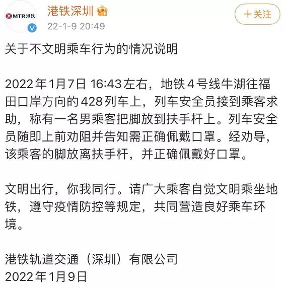 昨晚(1月9日),港铁轨道交通(深圳)有限公司@港铁深圳 发布《关于不文明乘车行为的情况说明》:2022年1月7日16:43左右,地铁4号线牛湖往福田口岸方向的428列车上,列车安全员接到乘客求助,称有一名男乘客把脚放到扶手杆上。列车安全员随即上前劝阻并告知需正确佩戴口罩。经劝导,该乘客的脚放离扶手杆,并正确佩戴好口罩。
