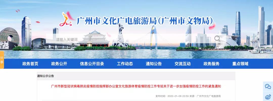 记者从广州市文化广电旅游局获悉,《广州市新型冠状病毒肺炎疫情防控指挥部办公室文化旅游体育疫情防控工作专班关于进一步加强疫情防控工作的紧急通知》(以下简称通知)已于1月8日发布。 通知要求,暂停旅行社和在线旅游企业组团前往省内中高风险地区所在地级市(区),暂停经营省内中高风险地区所在地级市(区)“机票+酒店”业务,暂停经营旅游专列业务。 通知称,近日,国内疫情多点散发,多个城市加强出城人员管理,确需离开所在城市的,须持有48小时内核酸检测阴性证明。 为加强疫情防控政策衔接,进一步筑牢我市文化旅游体育疫情防线,根据市疫情防控工作有关工作部署和《广州市新型冠状病毒肺炎疫情防控指挥部办公室关于印发广州外地市发生本土疫情应急响应及信息报送工作方案的通知》(穗防控办〔2021〕75号)、《广东省文化和旅游厅关于印发文化和旅游行业2022年元旦春节期间新冠肺炎疫情防控工作方案的通知》(粤文旅市〔2021〕248号)等文件精神,现将加强疫情防控工作的有关要求通知如下: 强化健康码、行程码查验 从即日起,各文化旅游体育场所和各类文化旅游体育活动主办方要严格落实疫情防控管理各项措施,加强入口查验力度,对来自须持48小时核酸阴性证明离开城市的游客,要查验防疫行程卡和48小时核酸阴性证明。严禁红、黄码人员进入,发现红、黄码人员及时通知社区“三人小组”落实健康管理措施。 强化密闭、半密闭文化旅游体育场所管控 加强影剧院、游艺娱乐场所、上网服务场所、歌舞娱乐场所、麻将馆、棋牌室、健身房、室内泳池等人员聚集的密闭、半密闭场所防控管理,接待人数不超过接待量的75%,落实“四强化一提倡”等疫情防控措施。按照各区疫情防控指挥办的指引,定期组织员工进行核酸检测,特别是对保洁、检票、讲解、导游、服务人员、安保等高频次直接接触市民游客的一线工作人员开展核酸检测,做到早发现早隔离。 强化旅行社组团业务管理