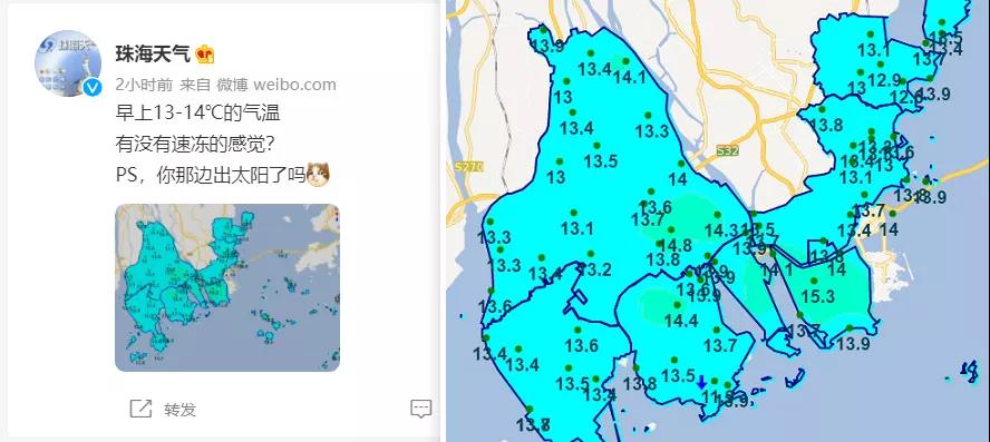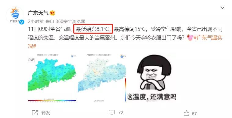 紧急提醒 所有珠海人 今晚下班早点回家! 因为怕你今晚在外面冻到“腾腾震”! 新一波冷空气 ↓↓↓ 小编知道 前几天的新年第一波冷空气 你们根本不放在眼里 ↓ 但是这次来真的! 据@广东天气 消息 冷空气已经杀到 截止11日9时,广东全省气温 最低始兴只有8.1℃ ▼ 这都还不止 昨晚开始广东大部分地区 都下起了小雨 ▼ 这就让体感温度更加低了 现在的体感温度 只有12℃ ▼ 预计过程日平均气温: 中北部↓3-5℃、南部↓2-3℃ 过程最低气温出现在12日早晨 粤北的北部市县5~7℃ (高海拔山区2~4℃) 其余市县7~17℃ 11日,粤北、珠三角北部、粤西的北部市县分散小雨转阴天间多云,其余市县零星小雨转多云。早晨最低气温:粤北的北部市县6~8℃(高海拔山区4~5℃),雷州半岛17~18℃,南部市县12~14℃,其余市县8~12℃。 12日,全省大部多云间晴天为主。早晨最低气温:粤北的北部市县5℃~7℃(高海拔山区2~4℃),雷州半岛16~17℃,南部市县11~13℃,其余市县7~11℃。 13日,韶关和清远两市的北部、肇庆、粤西的北部地区多云间阴天为主,其余市县多云间晴为主。 海面大风:11日,台湾海峡6级转7~8级阵风9级,北部湾海面5级转6~7级阵风8级,粤东海面5~6级转6~7级阵风8级,珠江口外海面、粤西海面5级转6级阵风7级。 珠海未来7天天气 今天一早,小编根本是没办法起床的 因为…你们都懂的 是床和被子不让起床 ↓ 早上13-14℃的气温 有没有速冻的感觉? PS,你那边出太阳了吗 据天气预报说 明!天!会!更!冷! 最低只有12℃ ↓ 珠海市气象局1月11日10时发布特别天气提醒:受冷空气影响,今明两天我市沿岸和海面风力较大,阵风可达7-8级,滨海游玩,海上作业、交通需注意安全。 受冷空气影响,预计未来三天我市晴到多云天气为主,早晚寒凉;本周末气温回升,云量明显增多,早晚有雾或分散小雨。温馨提示:今明两天海面风力较大,请注意海上交通安全,同时早晚寒凉,注意添衣保暖,谨防感冒。 再次提醒大家 早晚能见度低,需注意交通安全 海面风力大,请注意安全 昼夜温差较大,早晚寒凉 需注意适时增减衣物 火险等级仍然较高 需注意用火用电安全和森林防火 安全第一! 安全第一! 安全第一! 今晚早点回家躲被窝! 明天上班上学穿厚点! 预防感冒!口罩要戴好哦! (我决定明天穿羽绒上班~) 原标题《紧急提醒!珠海人今晚下班快点回家…》 来源:珠海吃喝玩乐行微信公众号、综合流行东莞、珠海天气、珠海气象、南方日报,版权归原作者所有,所有侵权请联系删除。 |