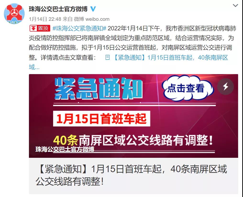昨晚,珠海公交发布紧急通知:于1月15日公交运营首班起,对南屏区域运营公交实行大调整。