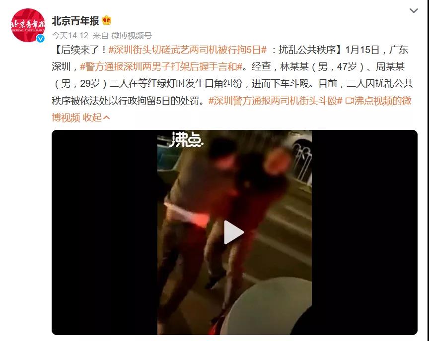 1月14日,网上流传一段视频,两名司机在路边当众斗殴,事后双方握手离去。警方迅速开展调查处置。