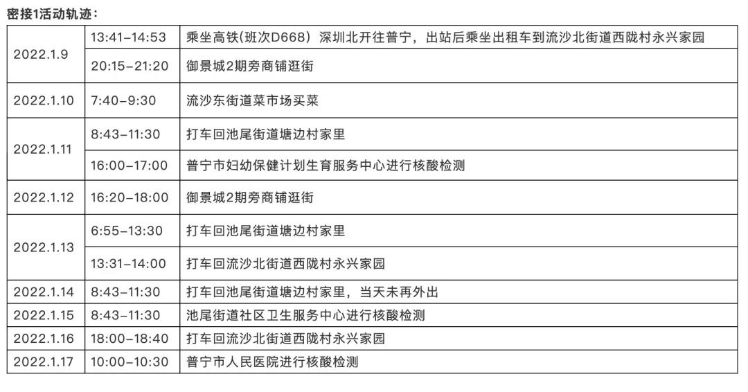 2022年1月17日9时许,普宁市疾控中心收到深圳市龙岗区疾控中心来函反馈有一名密接者(密接1)在普宁市;同日17时许,一名密接者(密接2)电话报告其本人于1月11日-1月13日曾在普宁市活动。