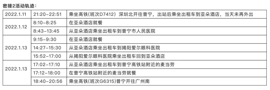 接报后,普宁市立即进行核实并开展流调溯源,对密接者、次密接者和重点人群落实管控措施,开展环境标本采样和终末消毒。目前,密接者、已排查到的次密接者和重点人群核酸检测结果均为阴性。通过流行病学调查,现将两名密切接触者在普主要行程轨迹公布如下: