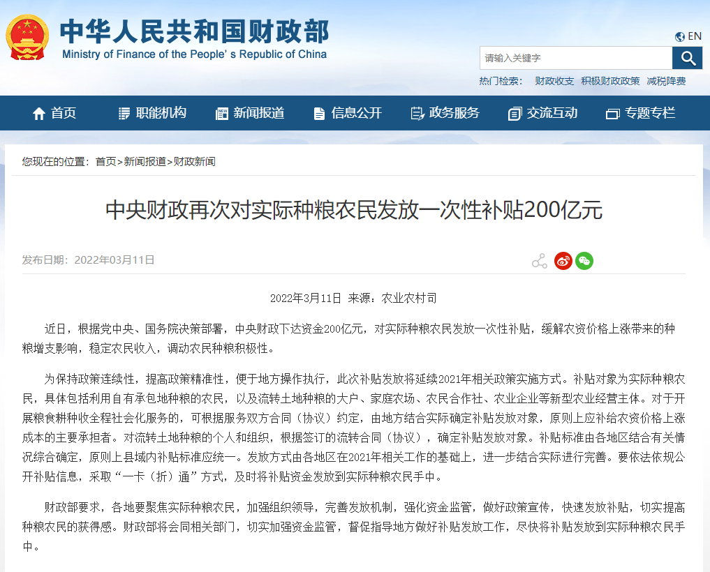 : 3月11日财政部官网发布消息中央财政再次对实际种粮农民发放一次性补贴200亿元!近日,根据党中央、国务院决策部署,中央财政下达资金200亿元,对实际种粮农民发放一次性补贴,缓解农资价格上涨带来的种粮增支影响, ...