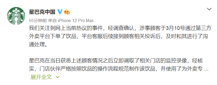 12日晚,@星巴克中国回应:我们关注到网上当前热议的事件,经调查确认,涉事顾客于3月10日通过第三方外卖平台下单了饮品,平台客服后续接到顾客相关投诉后,及时和其进行了沟通处理。 星巴克在当日获悉上述顾客情况之后立即调取了相关门店的监控录像,经核实,门店伙伴严格按照饮品的操作流程规范制作该饮品,并使用了为外卖专门设计的一次性密封防漏包装。同时,该门店消杀记录完整,我们也立即于3月10日当天和11日持续邀请第三方虫害服务公司进行了实地检查,并对相关设备进行了彻底检查,未发现相关虫害问题。感谢公众对星巴克的关注。