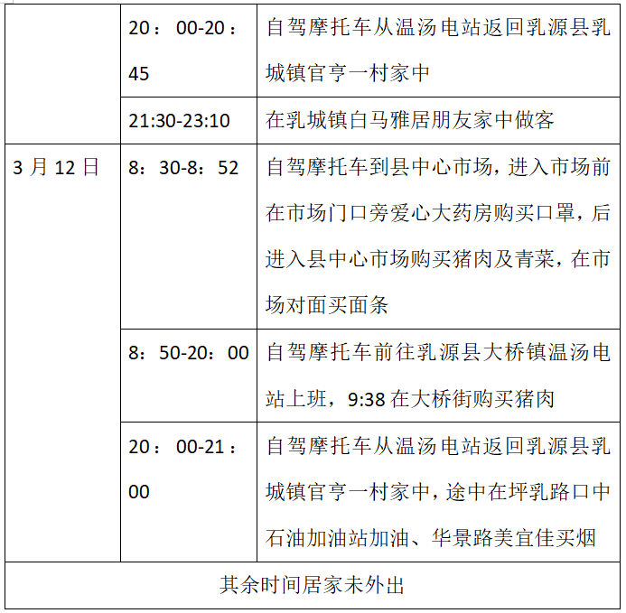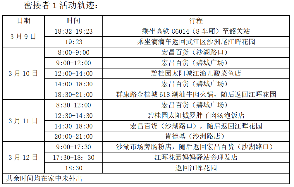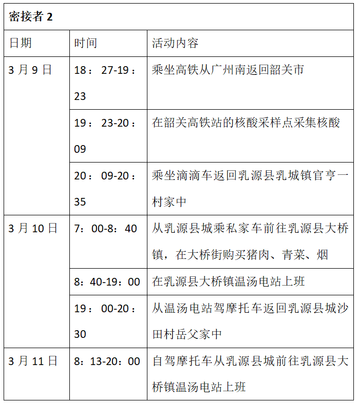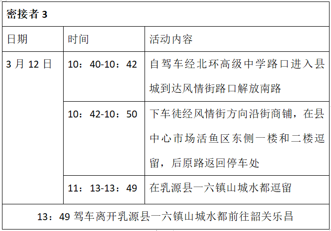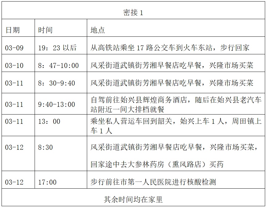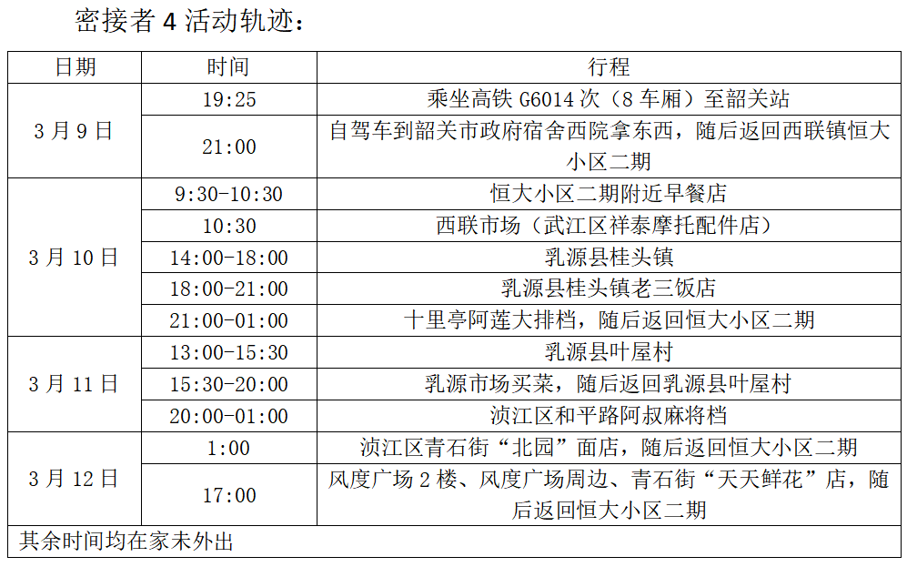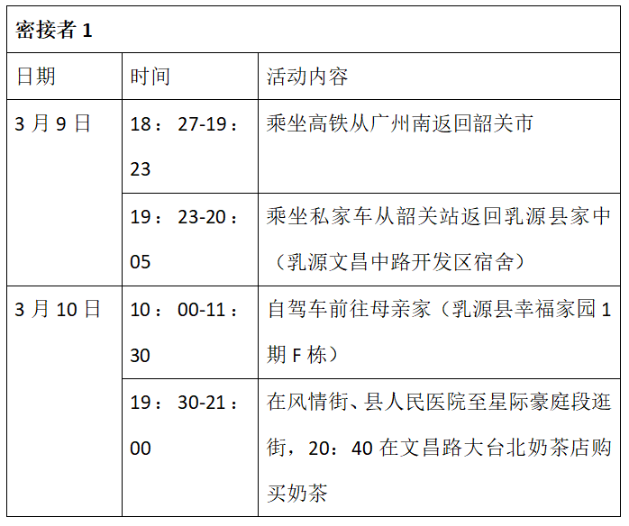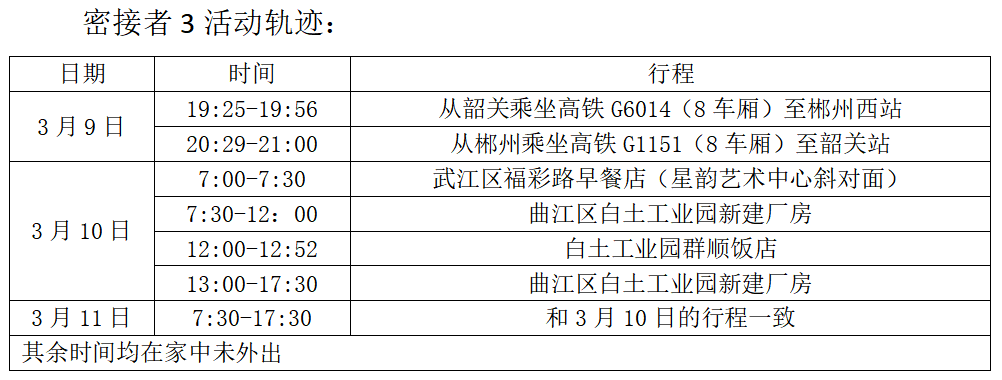 韶关市浈江区新冠肺炎 疫情防控指挥部办公室 2022年3月13日 韶关乳源发现3名密接者 3月13日,韶关市乳源瑶族自治县新型冠状病毒肺炎疫情防控指挥部办公室发布通告,详情如下: 3月13日凌晨,乳源瑶族自治县接到通报,3名新冠肺炎密切接触者(其中一名密接接报时已离开乳源)在该县活动。乳源立即启动应急响应,组织卫健、公安、疾控、乳城镇、一六镇等部门开展疫情防控工作。目前已对密接人员实施隔离医学观察,密接人员、次密接人员及其相关的重点环境、物品核酸检测均为阴性,并对涉及的重点场所进行了全面消杀。 现公布3名密切接触者的主要活动轨迹如下: 为全面落实疫情防控工作,确保公众健康安全,居民朋友如与密接者在同一时段、同一地点有交集的,尽快到所在村(居)委报备,并配合村(居)委及社区(乡镇)三人小组落实核酸检测和健康管理措施。途中请尽量不要乘坐公共交通工具,全程佩戴口罩,与他人保持1米以上距离,不交谈,不聚集。完成核酸采样后,可通过“粤康码”查询检测结果。请广大市民关注官方权威发布,不信谣、不传谣、不造谣、不恐慌,不前往中高风险地区。 当前国内外疫情防控形势依然严峻,为进一步做好我县新冠肺炎疫情防控工作,保护自己和家人健康安全,请广大市民配合做好以下工作: 一、请广大市民牢记自己是自身健康第一负责人,日常做到勤洗手、多通风、少聚集、积极锻炼身体;在公共场所要坚持科学佩戴口罩、保持社交距离、注意个人卫生。做好自己与家人身体健康监测,若出现发热、咳嗽、流涕等不适症状,在做好个人防护的前提下,到正规医疗机构就诊,就医过程中避免乘坐公共交通工具。 二、有韶关市外旅居史人员,在来(返)乳之前,请提前向目的地村委(社区)进行报备,说明来(返)乳行程和方式、健康状况、14天内旅居史、从事职业等信息。若未能提前报备,请在抵乳后48小时内,向居住地村委(社区)进行报备。并于抵乳后48小时内,前往核酸采样点进行一次核酸检测,并进行14天的自我健康监测。核酸检测结果未出前,尽量避免外出和乘坐公共交通工具、参加聚集性活动、前往人员密集场所。 三、各村委、社区,各行业主管部门、各企事业单位应对返乳群众、职工的假期旅居史情况进行摸排,做好粤康码及行程码的核验工作,如群众有涉疫地区旅居史,应敦促其向所在社区报备并配合相应防控措施。 四、在没有接种禁忌症的情况下,请符合条件的未完成全程接种的市民尽快接种新冠疫苗,完成全程接种满180天的市民尽快接种加强免疫,以获得最佳保护力。 乳源瑶族自治县 新型冠状病毒肺炎疫情 防控指挥部办公室 2022年3月13日 韶关乐昌公布密接者活动轨迹 3月13日,乐昌市新冠肺炎疫情防控指挥部办公室发布通告,详情如下: 3月13日凌晨,乐昌市疾控中心接密切接触者协查函。接报后,该市立即启动应急响应开展调查处置工作,目前该名密接已送集中隔离点,密接人员、次密接人员及其相关的重点环境、物品核酸检测均为阴性,涉及的重点场所进行了全面消杀。 现公布该名密接者的主要活动轨迹如下: 为全面落实疫情防控工作,确保公众健康安全,请与密接者在同一时段、同一地点有交集者,尽快到所在村(居)委报备,并到就近的医疗机构开展一次核酸检测,尽量不要乘坐公共交通工具,全程佩戴口罩,与他人保持1米以上距离,不交谈,不聚集。完成核酸采样后,可通过“粤康码”查询检测结果。 请广大市民关注官方权威发布,不信谣、不传谣、不造谣、不恐慌。当前疫情防控常态化,市民朋友应日常做到勤洗手、多通风、少聚集、积极锻炼身体;在公共场所要坚持科学佩戴口罩、保持社交距离、注意个人卫生,不前往中高风险地区。请广大群众积极接种新冠疫苗,特别是3-11岁和60岁以上人群完成疫苗全程接种,以及18岁以上完成全程接种满6个月的人群主动接种加强针。