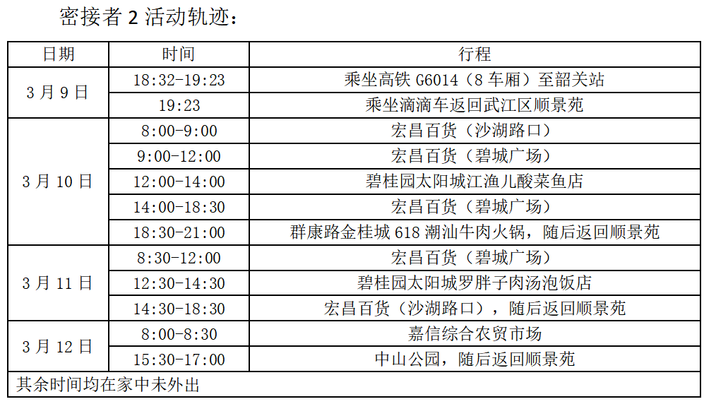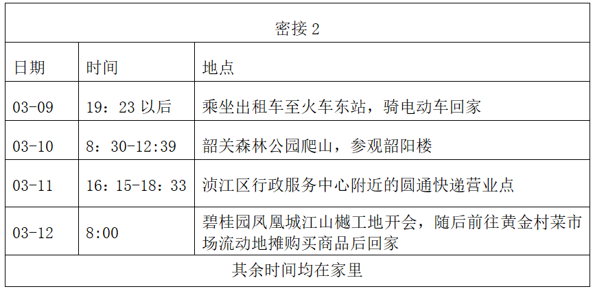 韶关 韶关市武江区发现4名密接者 3月13日,韶关市武江区新冠肺炎疫情防控指挥部办公室发布通告,详情如下: 3月13日0时,武江区疫情防控指挥部办公室接市疾控中心通知,发现4名密切接触者在该区活动。接报后,武江区立即启动应急响应,开展疫情处置工作。目前,4名密接者核酸检测结果为阴性,密接及其次密已送集中隔离医学观察,涉及的重点场所进行了全面消杀。 4名密接者在韶关的主要活动轨迹公布如下: 为全面落实疫情防控工作,确保公众健康安全,请与密接者在同一时段、同一地点有交集人员,及时到就近的医疗机构开展一次核酸检测+14天自我健康监测,尽量不要乘坐公共交通工具,全程佩戴口罩,与他人保持1米以上距离,不交谈,不聚集。如接到省内、外各级疾控部门或公安部门电话告知为密切接触者等风险人员,请记清被告知的涉疫信息和对方的联系方式,做好个人防护后自我隔离,并立即向所在(村)社区电话报告,配合做好相应健康管理措施。有韶关市外旅居史人员,请返回武江后到所在村(社区)报备,并主动做一次核酸检测,检测结果可通过“粤康码”查询。 请广大市民关注官方权威发布,不信谣、不传谣、不造谣、不恐慌。当前处于常态化疫情防控时期,市民朋友应日常做到勤洗手、多通风、少聚集、积极锻炼身体;在商场、超市、市场等公共场所要坚持科学佩戴口罩、保持社交距离、注意个人卫生,不前往中高风险地区,尽量减少接触中高风险地区返韶人员。请广大群众积极接种新冠疫苗,特别是3-11岁和60岁以上人群完成疫苗全程接种,以及18岁以上完成全程接种满6个月的人群主动接种加强针。 每个人都是自己健康的第一责任人,请积极配合属地政府和卫生健康部门完成疫情防控措施。如果刻意隐瞒行程、拒绝接受核酸检测或不配合疫情防控,将被依法追究责任。 韶关市武江区新冠肺炎疫情防控 指挥部办公室 2022年3月13日 韶关市浈江区发现2名密接者 3月13日,韶关市浈江区新冠肺炎疫情防控指挥部办公室发布通告,详情如下: 3月13日0时左右,浈江区发现2名密接者,该区立即启动应急响应,开展疫情处置工作。目前,2名密接者核酸检测结果为阴性,并已落实集中隔离医学观察,密接者相关的次密及重点人员、重点环境、物品核酸检测均为阴性,对涉及的重点场所进行了全面消杀。 2名密接者在韶关的主要活动轨迹如下: 为全面落实疫情防控工作,确保公众健康安全,请与密接者在同一时段、同一地点有交集人员,尽快向所在村(居)委报备,及时到就近的二级以上医院开展一次核酸检测+14天自我健康监测,尽量不要乘坐公共交通工具,全程佩戴口罩,与他人保持1米以上距离,不交谈,不聚集。接到省内外(市、县、区)各级疾控部门或公安部门电话告知的密切接触者等风险人员,请记清告知的涉疫信息和对方的联系方式,戴好口罩,与其他人保持距离,立即向所在社区(村)电话报告,配合做好相应健康管理措施。有韶关市外旅居史人员,返浈后报备到所在村(社区),并主动做一次核酸检测。完成核酸采样后,可通过“粤康码”查询检测结果。 请广大市民关注官方权威发布,不信谣、不传谣、不造谣、不恐慌。当前疫情防控常态化,市民朋友应日常做到勤洗手、多通风、少聚集、积极锻炼身体;在公共场所要坚持科学佩戴口罩、保持社交距离、注意个人卫生,不前往中高风险地区。人民群众应积极接种新冠疫苗,完成全程接种,18岁以上接种第二剂已满6个月的人群主动接种第三剂加强针。 注: 每个人是自己健康的第一责任人,请积极配合属地健康排查、健康码查验等疫情防控措施。如果刻意隐瞒行程、拒绝接受核酸检测或不配合防控,依法追究责任。