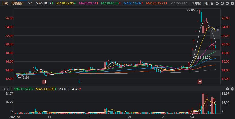 跌幅第四的是青木股份,本周下跌25.32%,股价大起大落,周一盘中一度下跌近20%。公司主营业务为为全球知名品牌提供一站式综合电商服务,属于互联网电商板块。该股是一只次新股,上周五上市,本周创出上市以来新低。 跌幅第五的是天顺股份,本周下跌24.43%,周一和周二都是一字板跌停。公司主营业务为从事大宗货物和大件货物的第三方物流和供应链管理业务,属于物流板块。该股曾在2月底出现连续七连板涨停走势,之后大幅回调。