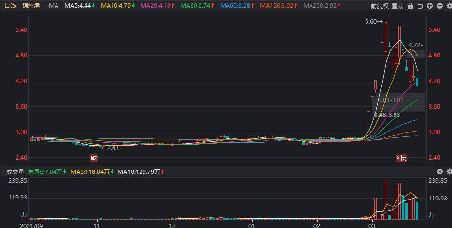 跌幅第二的是赛伦生物,本周跌幅为27.76%,周一至周三连续下跌,后两个交易日反弹。公司的主营业务为研究、开发、生产及销售针对生物毒素及生物安全领域的预防和治疗药物,属于生物制品板块。该股也是一只次新股,上周五上市,首日上涨67.42%,本周明显下跌。 跌幅第三的是锦州港,本周跌幅为25.73%,周一和周二均跌停。公司主营业务为从事油品,粮食,金属矿石和钢材等大宗货物的装卸,堆存,运输等港口业务,属于航运港口板块。该股此前曾出现过六连板涨停走势,近期出现降温。