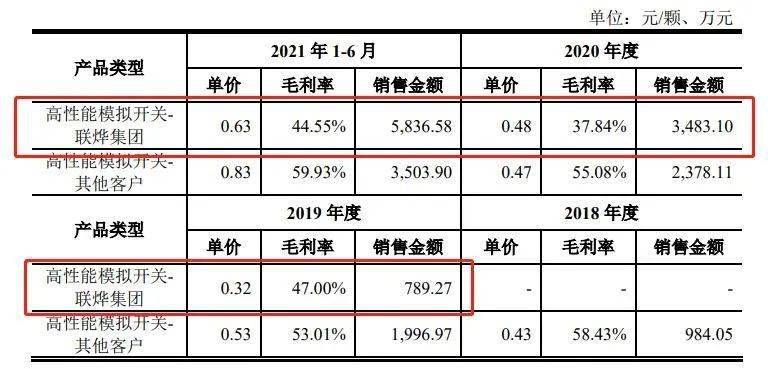 经销商返利差异较大 记者了解到,帝奥微目前主要采取经销模式,且为买断式经销模式。具体来看,公司根据经销商需求向其发货并在其签收货物后确认销售收入。经销商在采购公司产品后自行承担产品销售、库存等风险,最终客户直接向经销商下订单并付款,经销商收到订单后向最终客户发货。 报告期各期,公司经销收入9489.67万元、1.34亿元、2.43亿元、2.18亿元, 在各期主营业务收入中占比分别高达97.46%、98.04%、98.17%和 97.81%,95%以上均为买断式经销。 在公司的一众大客户中,目前第一大客户系经销商联烨集团及其控制下的企业。上文提到,联烨集团系帝奥微2019年新增的大客户,且2020年开始成为第一大客户,主要终端客户为OPPO。2019年、2020年及2021年1-6月,公司向联烨集团销售收入占主营业务收入比例分别为13.7%、19.06%和30.01%,主要销售产品为信号链产品。 根据公开资料,联烨集团主要通过深圳市联烨电子科技有限公司、Leyan Electronics Technology (HK) Co., Limited 与公司开展交易,其中前者成立于2017年, 第二家公司则于2019年成立,即成立不久便与帝奥微合作并很快成为其第一大客户。 从销售单价和毛利率上看,自从与联烨集团合作以来,帝奥微向其销售的高性能模拟开关单价均低于其他客户,对应的毛利率也相对较低。